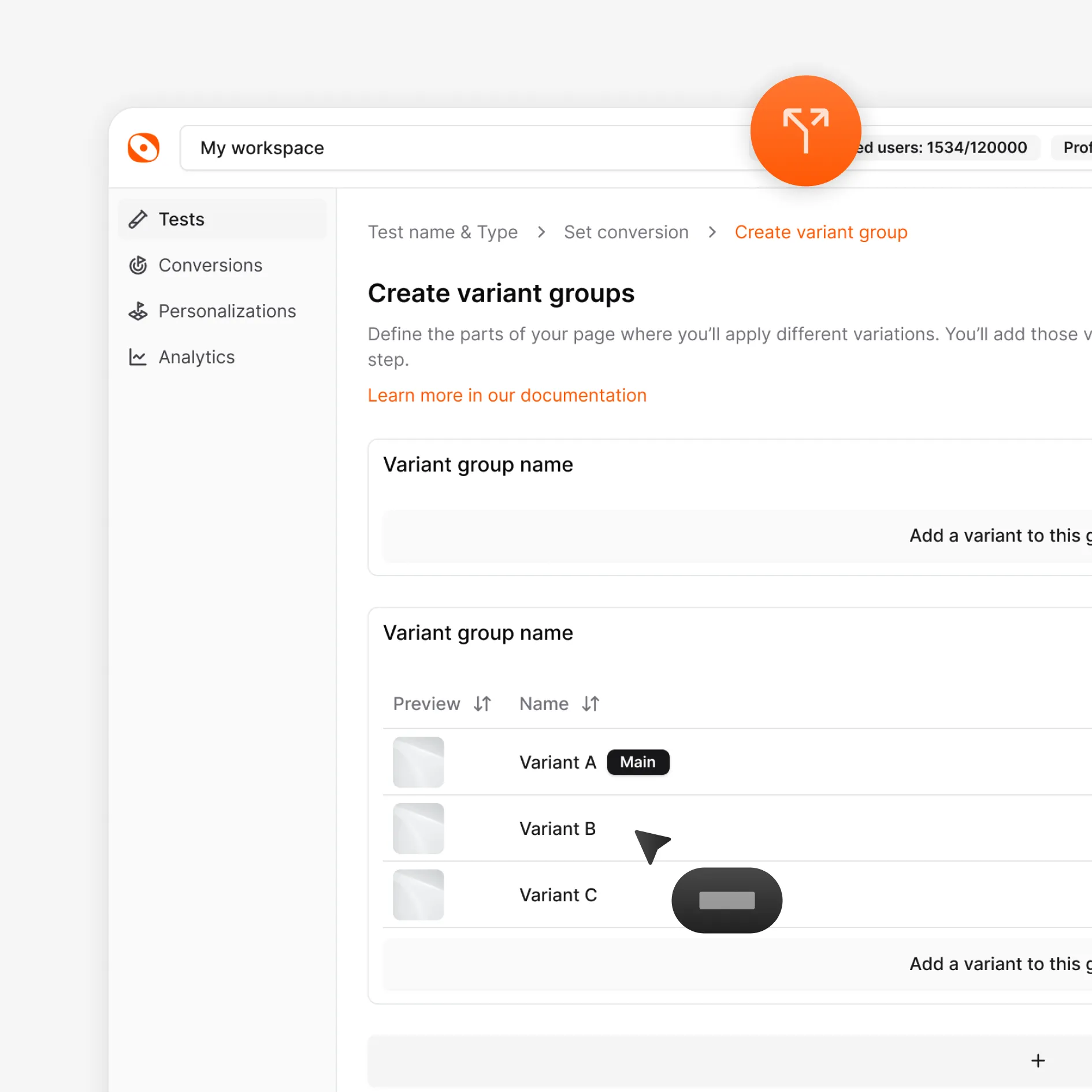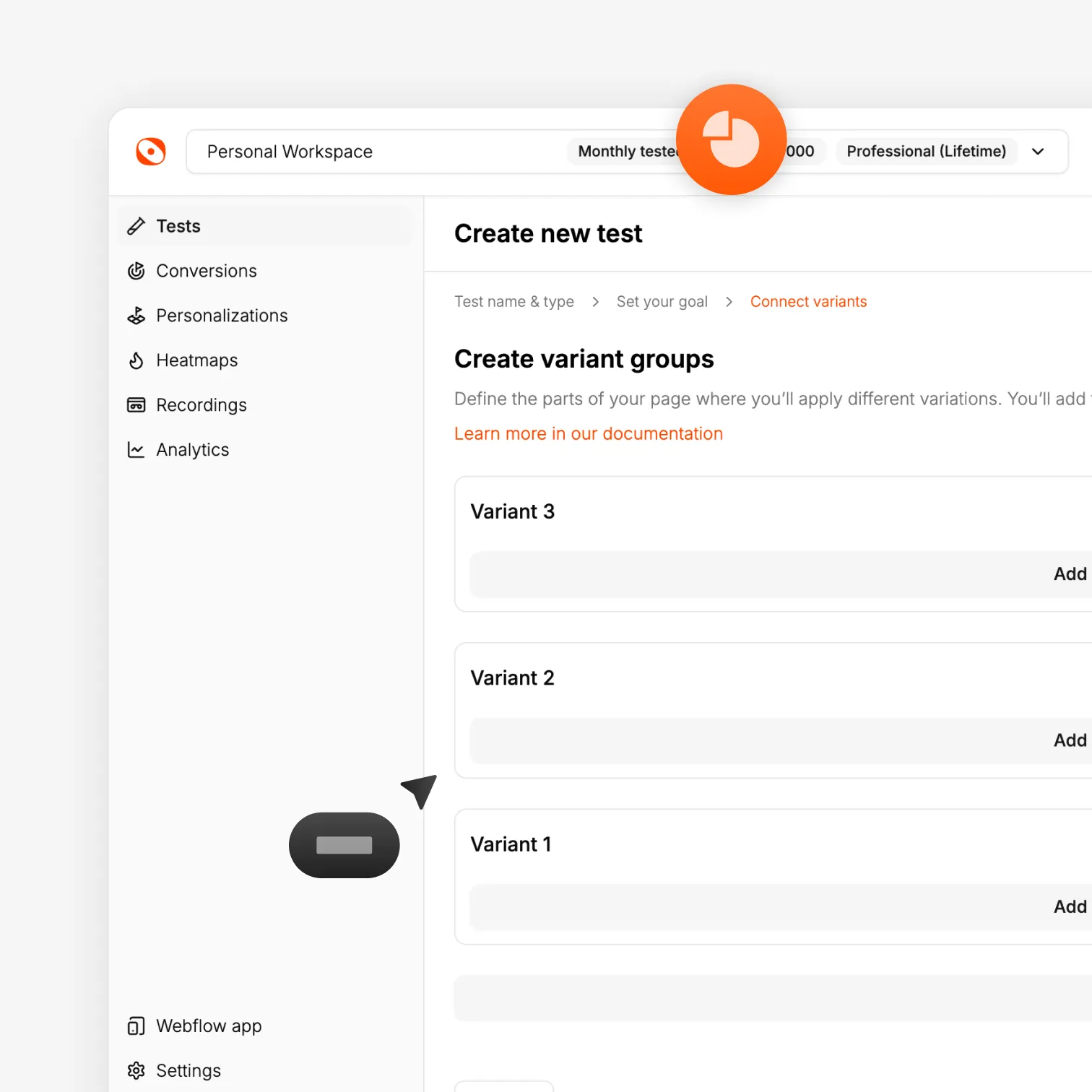 Choose how you want to measure success for your multivariate test. You can track clicks, form submits, page views, scroll depth, time on page, or custom events. Mark elements with the Webflow App or add IDs manually. All combinations use the same goals, so results stay fair and easy to compare.